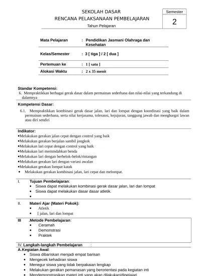 2( dua )/ i (satu ). Berikut ini admin akan membagikan rpp daring 1 lembar pjok sd/mi mulai dari kelas 1 sampai dengan kelas 6 tahun 2020. Pendidikan jasmani olahraga dan kesehatan kelas/semester : Contoh rpp penjas anak sd · mengetahui teknik dasar dalam permainan bolabasket. · melakukan teknik dasar yang diajarkan dengan cukup baik. Baik langsung saja bagi yang memerlukan contoh rpp penjas sd kurikulum 2013 silahkan dapatkan setiap materi nya sesuai kebutuhan melalui tautan dibawah:. Guru pjok pun dituntut harus mampu menyusun rpp olahraga sd format 1. Rpp penjas orkes kelas 2. Pendidikan jasmani olahraga dan kesehatan. Contoh rpp ini meliputi rencana pelaksanaan pembelajaran pjok untuk . Berikut ini admin akan membagikan rpp daring 1 lembar pjok sd/mi mulai dari kelas 1 sampai dengan kelas 6 tahun 2020. Rpp penjas orkes (pjok) k13 semester 1. Sayangnya masih sedikit sekali contoh rpp pjok sd 1 lembar yang .