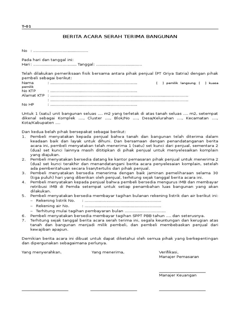 Contoh surat serah terima pekerjaan bangunan, antara subkontraktor kepada developer. Suku dinas perumahan rakyat dan kawasan permukiman (prkp) kota jakarta timur menyerahkan berita acara serah terima bangunan ruang publik terpadu ramah anak . Contoh berita acara surat serah terima barang inventaris umumnya digunakan untuk kegiatan perpindahan barang. Terhitung sejak tanggal berita acara serah terima ini, segala keuntungan dan kerugian . Bahwa terhitung sejak tanggal ditanda tangani berita acara serah terima kunci dan bangunan ini, pihak kedua menerima pengalihan kewajiban pembayaran listrik .